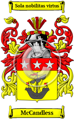 | McCandless History, Family Crest & Coats of Arms Early Origins of the McCandless familyThe surname McCandless was first found in Galloway (Gaelic: Gall-ghaidhealaibh), an area of southwestern Scotland, now part of the Council Area of Dumfries and Galloway, that formerly consisted of the counties of Wigtown (West Galloway) and Kirkcudbright (East Galloway), where they held a family seat in Western Scotland. After the Norman Conquest of England many of Duke William's rebellious Barons moved north. The border became a convenient but turbulent no-man's land where the persecuted found haven. Many were given land by King Malcolm Canmore and later by King David of Scotland. Some Gallowegians were native Scots, some were Irish clans mostly from Ulster in the 13th century. The name was first recorded in Scotland about the 15th century in Wigtown. They may also have been McCanish sept of Atholl to the north. "Eight of this name appear in Wigtownshire in eighteenth century (Wigtown). William M'Candlish in Balmangan, 1794 (Kirkcudbright). In 1684 the name appears as Makkanless, McCandlish McAndlish M'Canleis, and M'Caunles (Parish). The spelling with Mac is probably now extinct. From Irish MacCuindlis or MacCuindilis, son of Cuindleas." 1 Early History of the McCandless familyThis web page shows only a small excerpt of our McCandless research. Another 122 words (9 lines of text) covering the years 1684, 1794, 1806, 1873 and 1890 are included under the topic Early McCandless History in all our PDF Extended History products and printed products wherever possible. McCandless Spelling VariationsSpelling variations of this family name include: McCandlish, McAndliss, McCandless, McChandliss, McChandlish, McChandless, McCandliss, McCaunless, McCaunles, McKanless, McCanless, Candlish and many more. Early Notables of the McCandless familyMore information is included under the topic Early McCandless Notables in all our PDF Extended History products and printed products wherever possible. McCandless Rankingthe United States, the name McCandless is the 6,069th most popular surname with an estimated 4,974 people with that name. 2 Migration of the McCandless family to IrelandSome of the McCandless family moved to Ireland, but this topic is not covered in this excerpt. Another 51 words (4 lines of text) about their life in Ireland is included in all our PDF Extended History products and printed products wherever possible.