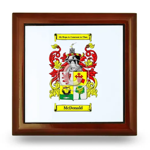 Made from the finest mahogany, this box has a brilliant lacquered cherry finish. Inside, you'll find cream-colored velvet. The hinged lid makes opening and closing this jewelry box easy. The Coat of Arms is heat-pressed onto a ceramic tile on the top of the box.