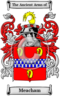 | Meacham History, Family Crest & Coats of Arms Etymology of MeachamWhat does the name Meacham mean? The Welsh Meacham surname is thought to derived from name of the village of Machen, located near Caerphilly, in the county of Monmouthshire. Alternatively, the name could have been derived from the name of an ancestor as in 'the son of Matthew.' 1 Early Origins of the Meacham familyThe surname Meacham was first found in Monmouthshire (Welsh: Sir Fynwy), at Machen, a parish, in the union of Newport, partly in the hundred of Wentlloog, South Wales. 2 Early History of the Meacham familyThis web page shows only a small excerpt of our Meacham research. Another 65 words (5 lines of text) covering the years 1541, 1600, 1614 and 1675 are included under the topic Early Meacham History in all our PDF Extended History products and printed products wherever possible. Meacham Spelling VariationsCompared to other ancient cultures found in the British Isles, the number of Welsh surnames are relatively few, but there are an inordinately large number of spelling variations. These spelling variations began almost as soon as surname usage became common. People could not specify how to spell their own names leaving the specific recording up to the individual scribe or priest. Those recorders would then spell the names as they heard them, causing many different variations. Later, many Welsh names were recorded in English. This transliteration process was extremely imprecise since the Brythonic Celtic language of the Welsh used many sounds the English language was not accustomed to. Finally, some variations occurred by the individual's design: a branch loyalty within a family, a religious adherence, or even patriotic affiliations were indicated by spelling variations of one's name. The Meacham name over the years has been spelled Machen, Machin, Machon, Mackon, Makin, Makins, MacMacken and many more. Early Notables of the Meacham familyThomas Machen (c. 1541-1614), an English mercer who was mayor of Gloucester three times, Member of Parliament for Gloucester in 1614; Bathsua Reginald Makin (c.1600-c.1675) English middle-class proto-feminist who contributed to the emerging criticism of woman’s position in domestic... Another 39 words (3 lines of text) are included under the topic Early Meacham Notables in all our PDF Extended History products and printed products wherever possible. Meacham Rankingthe United States, the name Meacham is the 4,043rd most popular surname with an estimated 7,461 people with that name. 3 Migration of the Meacham family to IrelandSome of the Meacham family moved to Ireland, but this topic is not covered in this excerpt. Another 31 words (2 lines of text) about their life in Ireland is included in all our PDF Extended History products and printed products wherever possible.