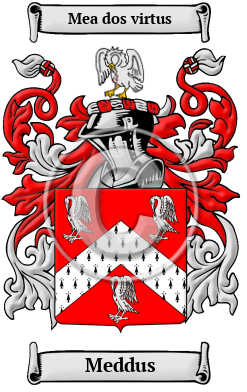 | Meddus History, Family Crest & Coats of Arms Etymology of MeddusWhat does the name Meddus mean? The lineage of the name Meddus begins with the Anglo-Saxon tribes in Britain. It is a result of when they lived in or near a meadow. The surname Meddus is derived from the Old English words mæd and mædwe, which both mean meadow. The surname Meddus belongs to the class of topographic surnames, which were given to people who resided near physical features such as hills, streams, churches, or types of trees. Early Origins of the Meddus familyThe surname Meddus was first found in Suffolk at Witnesham, a parish, in the union of Woodbridge, hundred of Carlford. "The family of Meadows, from a branch of which the present Earl Manvers is descended, have had a seat here since the time of Richard III." 1 Early History of the Meddus familyThis web page shows only a small excerpt of our Meddus research. Another 90 words (6 lines of text) are included under the topic Early Meddus History in all our PDF Extended History products and printed products wherever possible. Meddus Spelling VariationsOnly recently has spelling become standardized in the English language. As the English language evolved in the Middle Ages, the spelling of names changed also. The name Meddus has undergone many spelling variations, including Meadowes, Meadows, Meadow, Meddows, Meddus, Meadus, Medus, Medis and many more. Early Notables of the Meddus familyMore information is included under the topic Early Meddus Notables in all our PDF Extended History products and printed products wherever possible. Migration of the Meddus family to IrelandSome of the Meddus family moved to Ireland, but this topic is not covered in this excerpt. More information about their life in Ireland is included in all our PDF Extended History products and printed products wherever possible. Migration of the Meddus familyTo escape the unstable social climate in England of this time, many families boarded ships for the New World with the hope of finding land, opportunity, and greater religious and political freedom. Although the voyages were expensive, crowded, and difficult, those families that arrived often found greater opportunities and freedoms than they could have experienced at home. Many of those families went on to make significant contributions to the rapidly developing colonies in which they settled. Early North American records indicate many people bearing the name Meddus were among those contributors: Anne Meadowes settled with her husband in Virginia in 1684; Elizabeth Meadows and her husband settled in Annapolis in 1758; James and John Meadows settled in Philadelphia in 1860. Edmund Meadus of Poole, Dorset, settled in Newfoundland in the 1830'.