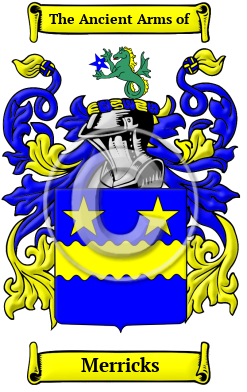 | Merricks History, Family Crest & Coats of Arms Etymology of MerricksWhat does the name Merricks mean? The ancestors of the Celtic name Merricks came from the rugged landscape of Wales. This old, proud name derives from the personal name Meuric, which is the Welsh form of Maurice. The surname Merricks is ultimately derived from the Latin personal name Mauritius, which means "dark." 1 In Britain, Maurice was the learned form of the name, while Morice was the common form. Early Origins of the Merricks familyThe surname Merricks was first found in Anglesey (Welsh: Ynys Môn), a Welsh-speaking island, and present day County of Isle of Anglesey, located at the northwestern extremity of Wales. The family was traditionally understood to be descended from Mrien, Lord of Rheged, through Cadaval Ynad, a Judge of Powys, who lived about 1190. The senior branch of the line settled in Anglesey where Samuel Cadaval was Lord of Cydywain. His son, Tudor ap Madoc, married the daughter of the Prince of North Wales. Einiawn Ap David, his successor was Usher at the Palace of Sheen. Early History of the Merricks familyThis web page shows only a small excerpt of our Merricks research. Another 158 words (11 lines of text) covering the years 1379, 1485, 1505, 1538, 1556, 1558, 1563, 1566, 1576, 1582, 1588, 1599, 1601, 1610, 1636, 1640, 1660, 1666, 1674, 1712, 1713 and 1714 are included under the topic Early Merricks History in all our PDF Extended History products and printed products wherever possible. Merricks Spelling VariationsCompared to other ancient cultures found in the British Isles, the number of Welsh surnames are relatively few, but there are an inordinately large number of spelling variations. These spelling variations began almost as soon as surname usage became common. People could not specify how to spell their own names leaving the specific recording up to the individual scribe or priest. Those recorders would then spell the names as they heard them, causing many different variations. Later, many Welsh names were recorded in English. This transliteration process was extremely imprecise since the Brythonic Celtic language of the Welsh used many sounds the English language was not accustomed to. Finally, some variations occurred by the individual's design: a branch loyalty within a family, a religious adherence, or even patriotic affiliations were indicated by spelling variations of one's name. The Merricks name over the years has been spelled Merrick, Merick, Meyrick, Meynik and others. Early Notables of the Merricks familyLlewelyn ap Meyrick who fought at the Bbattle of Bosworth on August 22, 1485 for Henry Tudor; and his son, Meurig ap Llewelyn, who became captain of the bodyguard for Henry VIII, he was granted the Crown Lease of Aberffraw manor; Rowland Meyrick (1505-1566), born at Bodargan in the parish of Llangadwaladr, Anglesey, a Welsh bishop of Bangor; John Meyrick (or Merick, Mericke, or Merrick), M.A. (1538-1599), an Anglican clergyman who served in the Church of England as the Bishop of Sodor and Man from 1576 to... Another 86 words (6 lines of text) are included under the topic Early Merricks Notables in all our PDF Extended History products and printed products wherever possible. Migration of the Merricks family to IrelandSome of the Merricks family moved to Ireland, but this topic is not covered in this excerpt. Another 36 words (3 lines of text) about their life in Ireland is included in all our PDF Extended History products and printed products wherever possible.