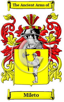 The surname Mileto was first found in Calabria a territorial district of Italy. Ancient Calabria was in Lecce. Modern Calabria is in the southern extremity of Italy coasting the straits of Messina. Reggio and Messina are the cities of note. This beautiful region produces wine. Olive oil and fruit. Reggio was heavily bombed during WWII because of its strategic link with Sicily. In those ancient times only persons of rank, the podesta, clergy, city officials, army officers, artists, landowners were entered into the records. To be recorded at this time, at the beginning of recorded history, was of itself a great distinction and indicative of noble ancestry. Pre-dating the use of surnames, was Saint Melito of Sardis (d. circa 180,) a second century Christian bishop, religious authority and prolific writer.