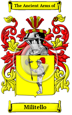 | Militello History, Family Crest & Coats of Arms Early Origins of the Militello familyThe surname Militello was first found in Calabria a territorial district of Italy. Ancient Calabria was in Lecce. Modern Calabria is in the southern extremity of Italy coasting the straits of Messina. Reggio and Messina are the cities of note. This beautiful region produces wine. Olive oil and fruit. Reggio was heavily bombed during WWII because of its strategic link with Sicily. In those ancient times only persons of rank, the podesta, clergy, city officials, army officers, artists, landowners were entered into the records. To be recorded at this time, at the beginning of recorded history, was of itself a great distinction and indicative of noble ancestry. Pre-dating the use of surnames, was Saint Melito of Sardis (d. circa 180,) a second century Christian bishop, religious authority and prolific writer. Early History of the Militello familyThis web page shows only a small excerpt of our Militello research. Another 122 words (9 lines of text) covering the years 1311 and 1334 are included under the topic Early Militello History in all our PDF Extended History products and printed products wherever possible. Militello Spelling VariationsSpelling variations of this family name include: Mileto, Mileti, Miletto, Miletti, Millette, Milleto, Milletti, Milito, Millito, Millitello, Militello and many more. Early Notables of the Militello familyMore information is included under the topic Early Militello Notables in all our PDF Extended History products and printed products wherever possible. Militello Rankingthe United States, the name Militello is the 18,083rd most popular surname with an estimated 2,487 people with that name. 1