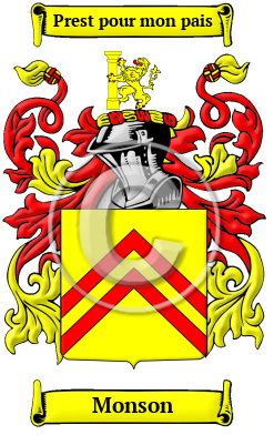 | Monson History, Family Crest & Coats of Arms Etymology of MonsonWhat does the name Monson mean? We must look to France for the early origins of the name Monson for it is here that the name was derived from Monceaux, who was descended from the ancient lords of Maers and Monceaux, Counts of Nevers. The Count of Nevers (c. 990) had a son named Landric of Nevers who was grandfather of William de Monson who is mentioned by Wace in 1066. This same person appears as William de Moncellis in the Exeter Domesday and as William de Nevers in Norfolk in 1086. 1 Early Origins of the Monson familyThe surname Monson was first found in Yorkshire and Lincolnshire where the aforementioned William's descendants settled. The ancestry of this distinguished Norman name can be traced to Carleton, Lincolnshire when they were Lords of the manor Antecedent to 1200. Thomas de Monceaux (d. 1345) seized the manors of Killingholm and Keleby. His son, Sir John de Monceaux (or Monson) (d. 1363) seized Burton, all in the Lincolnshire. 2 Early History of the Monson familyThis web page shows only a small excerpt of our Monson research. Another 80 words (6 lines of text) covering the years 1565, 1569, 1597, 1598, 1599, 1601, 1604, 1611, 1614, 1625, 1626, 1628, 1641, 1643, 1653, 1660, 1672, 1674, 1675, 1683, 1689 and 1718 are included under the topic Early Monson History in all our PDF Extended History products and printed products wherever possible. Monson Spelling VariationsA multitude of spelling variations characterize Norman surnames. Many variations occurred because Old and Middle English lacked any definite spelling rules. The introduction of Norman French to England also had a pronounced effect, as did the court languages of Latin and French. Therefore, one person was often referred to by several different spellings in a single lifetime. The various spellings include Monson, Munson, Mounson and others. Early Notables of the Monson family- Sir John Monson of South Carlton, Lincolnshire