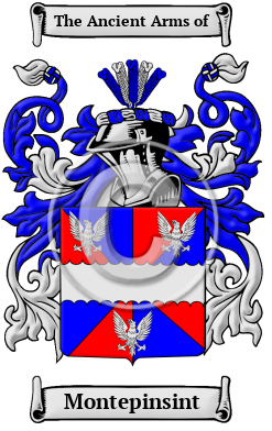 England Etymology of MontepinsintWhat does the name Montepinsint mean? Montepinsint is a name whose history on English soil dates back to the wave of migration that followed the Norman Conquest of England of 1066. The Montepinsint family lived in Devon. Their name, however, is a reference to Mont-Pincon, in Calvados, in the arrondissement of Lisieieux, Normandy, the family's place of residence prior to the Norman Conquest of England in 1066. Early Origins of the Montepinsint familyThe surname Montepinsint was first found in Devon where they held a family seat anciently as Lords of the Manor. The name originally was the Norman Mont-pincon or pincun from the barony and castle in Normandy. Ralf de Montpincon was the Norman noble dapifer who was granted lands in Devon for his assistance at the Battle of Hastings in 1066 A.D. Meanwhile in Normandy, the head of the family, Hugh de Monte Pincon held the service of three knights from Montpincon Castle in 1172. Migration of the family from Normandy to England continued for centuries as seen by Richard Pynson (died 1530) who was a Norman by birth, but was naturalized on 26 July 1513. He became a printer in London. "From his method of working it is clear that he learnt the art in Normandy, probably in the office of Guillaume le Talleur." 1 Burton Pynsent House is a historic country-house in the parish of Curry Rivel, Somerset. It was built in 1765 for William Pitt, 1st Earl of Chatham, after he inherited the estate from Sir William Pynsent (1642-1719.) "It was the property of Sir William Pynsent, Bart., and, with other estates, was left by him to the great Earl of Chatham, in testimony of respect for his character." 2 Pynsent Column stands on Troy Hill, a spur of high ground about 700 m north-east of the house. Early History of the Montepinsint familyThis web page shows only a small excerpt of our Montepinsint research. Another 99 words (7 lines of text) covering the years 1094, 1642, 1679, 1689, 1719, 1765, 1790, 1818, 1850, 1859 and 1864 are included under the topic Early Montepinsint History in all our PDF Extended History products and printed products wherever possible. Montepinsint Spelling VariationsA multitude of spelling variations characterize Norman surnames. Many variations occurred because Old and Middle English lacked any definite spelling rules. The introduction of Norman French to England also had a pronounced effect, as did the court languages of Latin and French. Therefore, one person was often referred to by several different spellings in a single lifetime. The various spellings include Pinson, Pincon, Pinsent, Pensent, Pensons, Pinsons, Pinser, Pincer, Poinson, Poincon, Pynson, MontPinson, Montpinson, Mountpinzo, Mompesson, Pinsun, Montepinson, Montepesson, Montepinsun and many more. Early Notables of the Montepinsint familySir William Pynsent or Pinsent, 1st Baronet (1642-1719), of Urchfont, Wiltshire, an English politician, Member of the Parliament for Devizes in 1689; and his son, Sir William Pynsent, 2nd Baronet (c.1679-1765), an English politician, Member of the Parliament for Taunton, unfortunately the title became extinct on his death in 1765. Continuing... Another 50 words (4 lines of text) are included under the topic Early Montepinsint Notables in all our PDF Extended History products and printed products wherever possible. Migration of the Montepinsint familyMany English families left England, to avoid the chaos of their homeland and migrated to the many British colonies abroad. Although the conditions on the ships were extremely cramped, and some travelers arrived diseased, starving, and destitute, once in the colonies, many of the families prospered and made valuable contributions to the cultures of what would become the United States and Canada. Research into the origins of individual families in North America has revealed records of the immigration of a number of people bearing the name Montepinsint or a variant listed above: William Pinsen who settled in Virginia in 1623; Joseph Pinson who settled in Virginia in 1663; Roger Pinson settled in Jamaica in 1665; Samuel Pinson settled in Barbados in 1685.
