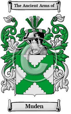 The surname Muden was first found in Devon where they held a family seat as Lords of the Manor. The Saxon influence of English history diminished after the Battle of Hastings in 1066. The language of the courts was French for the next three centuries and the Norman ambience prevailed. But Saxon surnames survived and the family name was first referenced in the 13th century when they held lands.