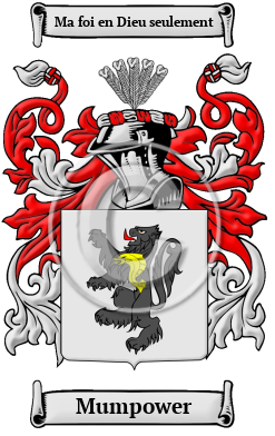 England Early Origins of the Mumpower familyThe surname Mumpower was first found in Cumberland where they held a family seat as Lords of the Manor. After the Battle of Hastings in 1066, William, Duke of Normandy, having prevailed over King Harold, granted most of Britain to his many victorious Barons. It was not uncommon to find a Baron, or a Bishop, with 60 or more Lordships scattered throughout the country. These he gave to his sons, nephews and other junior lines of his family and they became known as under-tenants. They adopted the Norman system of surnames which identified the under-tenant with his holdings so as to distinguish him from the senior stem of the family. After many rebellious wars between his Barons, Duke William, commissioned a census of all England to determine in 1086, settling once and for all, who held which land. He called the census the Domesday Book, 1 indicating that those holders registered would hold the land until the end of time. Hence, conjecturally, the surname is descended from the tenant of the lands, Monpesare, a Norman noble from a castle on the river Scie in Normandy, and who was recorded in the Domesday Book census of 1086. Early History of the Mumpower familyThis web page shows only a small excerpt of our Mumpower research. Another 144 words (10 lines of text) covering the years 1273, 1320, 1457, 1478, 1508, 1510, 1540, 1600, 1639, 1661, 1699, 1701, 1703, 1704, 1709 and 1715 are included under the topic Early Mumpower History in all our PDF Extended History products and printed products wherever possible. Mumpower Spelling VariationsSpelling variations of this family name include: Mumperson, Momperson, Nomperson, Nonperson, Mompesson, Mumpesson, Nonperson, Mounpynson, Moneyperson, Moneperson and many more. Early Notables of the Mumpower familyJohn Mompesson of Bathampton Wyly, who was High Sheriffs of Wiltshire in 1478 and in 1508; Edward Mompesson, who was High Sheriffs of Wiltshire in 1540; William Mompesson (1639-1709) Derbyshire clergyman, known for the decision to isolate the village of Eyam during the time of the Plague... Another 47 words (3 lines of text) are included under the topic Early Mumpower Notables in all our PDF Extended History products and printed products wherever possible. Migration of the Mumpower familySome of the first settlers of this family name or some of its variants were: Richard Mompesson, who arrived in Virginia in 1667.