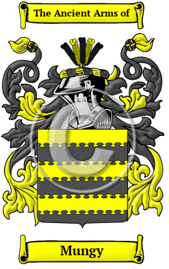 The surname Mungy was first found in Devon where they held a family seat from very early times and were granted lands by Duke William of Normandy, their liege Lord, for their distinguished assistance at the Battle of Hastings in 1066 A.D.
