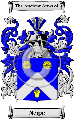 The surname Neipe was first found in Belgium, where the name became noted for its many branches in the region, each house acquiring a status and influence which was envied by the princes of the region. The name was first recorded in West Flanders, a province in Belgium, originally Bruges. Within this province the notable towns are Bruges, the capital city, Ostend, Courtrai, Furnes, Thielt, Ypres and Roulers. In their later history the surname became a power unto themselves and were elevated to the ranks of nobility as they grew into a most influential family.
