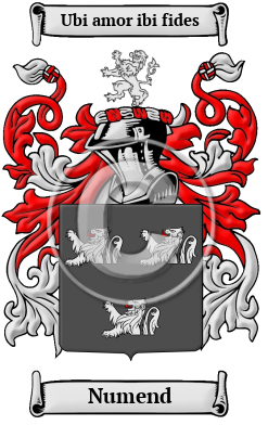| Numend History, Family Crest & Coats of Arms Etymology of NumendWhat does the name Numend mean? Numend is a name of Anglo-Saxon origin. It was a name given to a stranger or newcomer. The surname Numend is derived from the Old English words neowe, niwe, and nige, which all mean new, and the word mann, which means man. 1 "In Sussex documents of the XIII. cent. it is spelt Nieuweman, and latinized Novus Homo." 2 "Confined to the southern half of England and not occurring in any numbers north of a line drawn west from the Wash. It has evidently several homes, and is at present most frequently found in Essex, Wilts, Gloucestershire, and Worcestershire. This name signifies 'a stranger.' In the 13th century it was of frequent occurrence, as Neweman, in Cambridgeshire and Oxfordshire, and as Neuman it was also then common in Norfolk and Essex (Hundred Rolls), in which two counties it has been ever since established." 3 Early Origins of the Numend familyThe surname Numend was first found in Dorset, England where they held a family seat from early times. There are also early records of Stangrim Noueman listed in the Pipe Rolls of Norfolk in 1166; Godwin Nieweman listed in the Pipe Rolls of Oxfordshire in 1169; and Robert le Nyman in the Subsidy Rolls of Sussex in 1296. 4 The Hundredorum Rolls of 1273 lists four entries for the name: Robert Niweman in Cambridgeshire; Herbert le Niweman in Oxfordshire; Matthew Neuman in Huntingdon; and John le Neuman in Bedfordshire. 5 "Stockleigh, [Devon] a seat of the Newman family, whose principal residence is at Mamhead, is close by; and not far distant is the quaint fishing village of Torcross." 6 Early History of the Numend familyThis web page shows only a small excerpt of our Numend research. Another 81 words (6 lines of text) covering the years 1597, 1602, 1636, 1643 and 1663 are included under the topic Early Numend History in all our PDF Extended History products and printed products wherever possible. Numend Spelling VariationsBefore the last few hundred years, the English language had no fast system of spelling rules. For that reason, spelling variations are commonly found in early Anglo-Saxon surnames. Over the years, many variations of the name Numend were recorded, including Newman, Newmen, Newmin and others. Early Notables of the Numend familySamuel Newman (1602-1663), English-born, American clergyman in colonial Massachusetts, born in Banbury, Oxfordshire, he was prosecuted for nonconformity and emigrated to Massachusetts Bay Colony, c. 1636 where he... Another 28 words (2 lines of text) are included under the topic Early Numend Notables in all our PDF Extended History products and printed products wherever possible. Migration of the Numend family to IrelandSome of the Numend family moved to Ireland, but this topic is not covered in this excerpt. Another 64 words (5 lines of text) about their life in Ireland is included in all our PDF Extended History products and printed products wherever possible. Migration of the Numend familyTo escape oppression and starvation at that time, many English families left for the "open frontiers" of the New World with all its perceived opportunities. In droves people migrated to the many British colonies, those in North America in particular, paying high rates for passages in cramped, unsafe ships. Although many of the settlers did not make the long passage alive, those who did see the shores of North America perceived great opportunities before them. Many of the families that came from England went on to make essential contributions to the emerging nations of Canada and the United States. Research into various historical records revealed some of first members of the Numend family emigrate to North America: Alice Newman settled in Virginia in 1638; George Newman settled in Maine in 1630; Joe Newman settled in Virginia in 1635; along with John, Mountford, Richard, Thomas, and Robert.