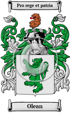 | Olean History, Family Crest & Coats of Arms Etymology of OleanWhat does the name Olean mean? The distinguished surname Olean is a proud example of one of the more noteworthy Scottish surnames. In Scotland, hereditary surnames were adopted according to fairly general rules and during the late Middle Ages, names that were derived from localities became increasingly widespread. Local names originally denoted the proprietorship of the village or estate. The Olean family originally lived in the Norman settlement of Lyons-la-Foret, before migrating to England and Scotland. 1 Early Origins of the Olean familyThe surname Olean was first found in Perthshire where Sir Roger de Lyon settled in Scotland in 1098 and called the lands there Glen Lyon. "According to the family tradition the Lyons came to Scotland from France, by way of England, in the course of the twelfth century." 2 However, it appears the family was indeed in England before the 1100s. "Ingelram de Lions came to England 1066, and held Corsham and Culington from the King. He had Ranulph, whose brother William de Lions had a grant in Norfolk from Earl Walter Giffard, and left descendants there." 1 Moving north into Scotland, "John de Lyon obtained from David II a grant of the baronies of Forteviot and Fergundeny in Perthshire and Drumgawan in Aberdeenshire; his son, Sir John Lyon, was Secretary to Robert II, whose youngest daughter, Lady Jane Stewart, he married, and was created Lord Glamis, made Great Chamberlain, and Lord Chancellor of Scotland, and received grants of the Thanedom of Glamis in Forfarshire, and of the Barony of Kinghorn in Fifeshire. " 3 Another source claims that the family arrived via England later. "The name was not uncommon in England in the twelfth and thirteenth centuries, and landowners of the name were in occupation in several of the English shires in the reigns of Edward I and Edward II. The first of the name recorded in Scotland, probably an English soldier, was Thomas Lyon, crossbowman, who formed one of the garrison of Linlithgow peel in the pay of Edward II. " 2 Mention should now be made of the numerous listings of the family in England at about the same time. Here it is generally thought that the first record of the name was Roger de Leonibus filius Jeffrey de Lions who was listed in the Feet of Fines of Norfolk during the reign of Henry III of England (reign 1216-1272.) The same source lists John de Leonibus in Southamptonshire and Peter de Leonibus in Northamptonshire. The Hundredorum Rolls of 1273 list: Judaeus Leo and Jacob filius Leonis in Lincolnshire; John Leon in Oxfordshire; and Roger de Lyons, Wiltshire. 4 Early History of the Olean familyThis web page shows only a small excerpt of our Olean research. Another 351 words (25 lines of text) covering the years 1066, 1105, 1203, 1275, 1310, 1332, 1334, 1342, 1371, 1381, 1393, 1411, 1425, 1445, 1499, 1509, 1525, 1550, 1643, 1663, 1695, 1696, 1702, 1707, 1712, 1715 and 1890 are included under the topic Early Olean History in all our PDF Extended History products and printed products wherever possible. Olean Spelling VariationsSpelling variations of this family name include: Lyon, Lions, Lyons and others. Early Notables of the Olean familyJohn Lyon, 2nd Earl of Kinghorne; and his son, Patrick Lyon, 3rd Earl of Strathmore and Kinghorne (1643-1695), a Scottish peer; John Lyon, 4th Earl of Strathmore and Kinghorne (1663-1712), a Scottish peer; John Lyon, 5th Earl of Strathmore and Kinghorne (1696-1715), a Scottish... Another 44 words (3 lines of text) are included under the topic Early Olean Notables in all our PDF Extended History products and printed products wherever possible. Migration of the Olean family to IrelandSome of the Olean family moved to Ireland, but this topic is not covered in this excerpt. Another 118 words (8 lines of text) about their life in Ireland is included in all our PDF Extended History products and printed products wherever possible. Migration of the Olean familySome of the first settlers of this family name or some of its variants were: John Lyon, who came to Barbados in 1634; William Lyon, who arrived at Boston in 1635; Thomas Lyon, who was on record in Connecticut in 1647; Walter Lyon, who was banished to America in 1662.