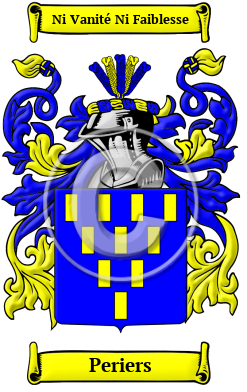 France Etymology of PeriersWhat does the name Periers mean? The name Periers is an ancient French name that was given to a person from Brittany who was a stone cutter as the name was originally derived from the Old French word Pierre meaning stone. Early Origins of the Periers familyThe surname Periers was first found in Brittany where they held a family seat in the seigneurie of Kerhuel and also at Launay in that same region. The family were elevated to the Comtes de Quintin in 1421. "An ancient and noble family of Brittany, traced in the archives of the Collège Héraldique at Paris, to the tenth century, and to the ancient dukes and princes of that province". 1 Early History of the Periers familyThis web page shows only a small excerpt of our Periers research. Another 91 words (6 lines of text) covering the years 1594, 1649, 1800, 1863, 1869 and 1875 are included under the topic Early Periers History in all our PDF Extended History products and printed products wherever possible. Periers Spelling VariationsMost surnames have experienced slight spelling changes. A son may not chose to spell his name the same way that his father did. Many were errors, many deliberate. During the early development of the French language, a person usually gave his version, phonetically, to a scribe, a priest, or a recorder. Prefixes or suffixes varied. They were optional as they passed through the centuries, or were adopted by different branches to signify either a political or religious adherence. Hence, there a many spelling variations of the name Periers, including Périer, Perrier, Perriere, Perrieres, Perriére, Périers, Perriers, du Perrier, La Perrier and many more. Early Notables of the Periers familyMore information is included under the topic Early Periers Notables in all our PDF Extended History products and printed products wherever possible. Migration of the Periers familyBy 1643 there were only about 300 people in Quebec. Since immigration was slow, early marriage was desperately encouraged amongst the immigrants. The fur trade attracted migrants, both noble and commoner. 15,000 explorers left Montreal in the late 17th and 18th centuries. By 1675, there were 7000 French in Quebec. By the same year the Acadian presence in Nova Scotia, New Brunswick and Prince Edward Island had reached 500. In 1755, 10,000 French Acadians refused to take an oath of allegiance to England and were deported to Louisiana. The French founded Lower Canada, thus becoming one of the two great founding nations of Canada. The distinguished family name Periers has made significant contributions to the culture, arts, sciences and religion of France and New France. Amongst the settlers in North America with this distinguished name Periers were Laurent Perrier who arrived in Quebec in 1690 from Guyenne; Peter Perrier arrived in America in 1774; Pierre Perrier arrived in Louisiana in 1752; George Perrier arrived in Philadelphia in 1805. In Newfoundland Dominic and Simon Perrier were fishermen at Sandy Point in George'.