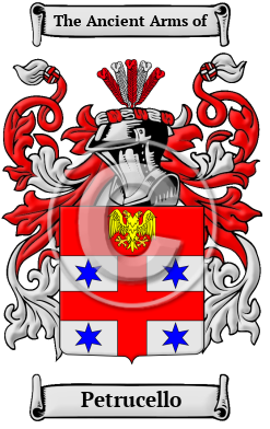 The surname Petrucello was first found in Florence (Italian: Firenze), where the first on record appears to be Domenico Petrucci, in 1439. His son Cesare was an administrator in Prato in 1470; and Cesare's son, Nicolo was an ambassador to the imperial court in Rome in 1491. There was a powerful family of this name in Siena in the 15th century. From the Petrucci di Pesaro family line, Donato, Francesco and Giambattista Petrucci were all ennobled by the Polish king Giovanni III in 1680.
