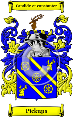 England Etymology of PickupsWhat does the name Pickups mean? The ancestors of the name Pickups date back to the days of the Anglo-Saxon tribes of Britain. The name is derived from their residence in Pickup or Pickup Bank in Lancashire. This place-name was originally derived from the Old English word pic-copp which referred to those individuals who lived on a hill with a sharp peak. 1 Early Origins of the Pickups familyThe surname Pickups was first found in Lancashire where they are "from a township and village in the parish of Walley, now styled Yatecum-Pickup Bank." 2 "The Pickups derive their name from Pickup Bank, or Piccopbanke, a, village in Whalley parish. In the 16th century the Piccopps lived at Lower Darwen, a family with which the Piccops of Eccleshill in the succeeding century were connected: from early in the 17th century the Pickops have held their own estate on the borders of Livesey and Tockholes." 3 The Wills at Chester had the following entries: Roger Piccop, of Over Whiteley, 1584; James Piccop, of Nether Darwen, 1592; John Piccope, of Rawtenstall, 1623; John Piccopp, of Eccleshill; Robert Holden, of Picope Bank, 1595; John Tattersall, of Piccope, 1581; and Robert Tattersall, of Piccope, yeoman, 1587. 2 Early History of the Pickups familyThis web page shows only a small excerpt of our Pickups research. Another 89 words (6 lines of text) are included under the topic Early Pickups History in all our PDF Extended History products and printed products wherever possible. Pickups Spelling VariationsPickups has been spelled many different ways. Before English spelling became standardized over the last few hundred years, spelling variations in names were a common occurrence. As the English language changed in the Middle Ages, absorbing pieces of Latin and French, as well as other languages, the spelling of people's names also changed considerably, even over a single lifetime. Many variations of the name Pickups have been found, including Pickup, Pickupp, Pickopp, Pickop, Picup and others. Early Notables of the Pickups familyMore information is included under the topic Early Pickups Notables in all our PDF Extended History products and printed products wherever possible. Migration of the Pickups familyIn an attempt to escape the chaos experienced in England, many English families boarded overcrowded and diseased ships sailing for the shores of North America and other British colonies. Those families hardy enough, and lucky enough, to make the passage intact were rewarded with land and a social environment less prone to religious and political persecution. Many of these families became important contributors to the young colonies in which they settled. Early immigration and passenger lists have documented some of the first Pickupss to arrive on North American shores: James, Joseph and William Pickup, who all settled in Philadelphia between 1853 and 1868.