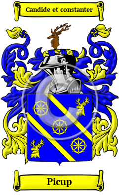 England Etymology of PicupWhat does the name Picup mean? The name Picup is an old Anglo-Saxon name. It comes from when a family lived in Pickup or Pickup Bank in Lancashire. This place-name was originally derived from the Old English word pic-copp which referred to those individuals who lived on a hill with a sharp peak. 1 Early Origins of the Picup familyThe surname Picup was first found in Lancashire where they are "from a township and village in the parish of Walley, now styled Yatecum-Pickup Bank." 2 "The Pickups derive their name from Pickup Bank, or Piccopbanke, a, village in Whalley parish. In the 16th century the Piccopps lived at Lower Darwen, a family with which the Piccops of Eccleshill in the succeeding century were connected: from early in the 17th century the Pickops have held their own estate on the borders of Livesey and Tockholes." 3 The Wills at Chester had the following entries: Roger Piccop, of Over Whiteley, 1584; James Piccop, of Nether Darwen, 1592; John Piccope, of Rawtenstall, 1623; John Piccopp, of Eccleshill; Robert Holden, of Picope Bank, 1595; John Tattersall, of Piccope, 1581; and Robert Tattersall, of Piccope, yeoman, 1587. 2 Early History of the Picup familyThis web page shows only a small excerpt of our Picup research. Another 89 words (6 lines of text) are included under the topic Early Picup History in all our PDF Extended History products and printed products wherever possible. Picup Spelling VariationsBefore the last few hundred years, the English language had no fast system of spelling rules. For that reason, spelling variations are commonly found in early Anglo-Saxon surnames. Over the years, many variations of the name Picup were recorded, including Pickup, Pickupp, Pickopp, Pickop, Picup and others. Early Notables of the Picup familyMore information is included under the topic Early Picup Notables in all our PDF Extended History products and printed products wherever possible. Migration of the Picup familyTo escape oppression and starvation at that time, many English families left for the "open frontiers" of the New World with all its perceived opportunities. In droves people migrated to the many British colonies, those in North America in particular, paying high rates for passages in cramped, unsafe ships. Although many of the settlers did not make the long passage alive, those who did see the shores of North America perceived great opportunities before them. Many of the families that came from England went on to make essential contributions to the emerging nations of Canada and the United States. Research into various historical records revealed some of first members of the Picup family emigrate to North America: James, Joseph and William Pickup, who all settled in Philadelphia between 1853 and 1868.