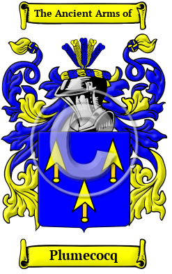 The surname Plumecocq was first found in Brittany, originally Armorica in ancient times, where the family has been a prominent family for centuries, and held a family seat with lands and manor. The family were well established in the region of Dol and several members of the family distinguished themselves through their contributions toward the community in which they lived and were rewarded with lands, titles and letters patent confirming their nobility.