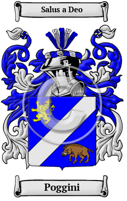 The surname Poggini was first found in Piedmont (Italian: Piemonte, Piedmontese and Occitan: Piemont), a territorial division of northern Italy at the foot of the Alps consisting of the provinces of Alessandria, Cuneo, Novara and Turin. Later Aosta and Vercelli were added and still later, Asti. History is related back to 49 B.C. The house of Savoy rose in 1000 A.D. In those ancient times only persons of rank, the podesta, clergy, city officials, army officers, artists, landowners were entered into the records. To be recorded at this time, at the beginning of recorded history, was of itself a great distinction and indicative of noble ancestry.