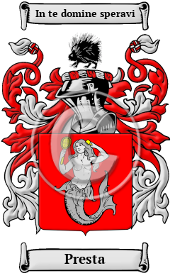 | Presta History, Family Crest & Coats of Arms Etymology of PrestaWhat does the name Presta mean? Presta is a name of ancient Anglo-Saxon origin and comes from the family once having lived in Prestwick, Northumberland, or in Prestwich, in Cheshire. Prestwich is now part of Greater Manchester. The place names Prestwick and Prestwich have an identical etymology; they are derived from the Old English words preost, which meant priest, and wic, which meant farm. The place names taken as a whole mean "priest's farm." Early Origins of the Presta familyThe surname Presta was first found in Lancashire where they held a family seat from early times and their first records appeared on the census rolls taken by the ancient Kings of Britain to determine the rate of taxation of their subjects. Early History of the Presta familyThis web page shows only a small excerpt of our Presta research. Another 85 words (6 lines of text) covering the year 1250 is included under the topic Early Presta History in all our PDF Extended History products and printed products wherever possible. Presta Spelling VariationsSound was what guided spelling in the essentially pre-literate Middle Ages, so one person's name was often recorded under several variations during a single lifetime. Also, before the advent of the printing press and the first dictionaries, the English language was not standardized. Therefore, spelling variations were common, even among the names of the most literate people. Known variations of the Presta family name include Prestwick, Preswick, Preswicke, Prestwich and others. Early Notables of the Presta familyMore information is included under the topic Early Presta Notables in all our PDF Extended History products and printed products wherever possible. Migration of the Presta family to IrelandSome of the Presta family moved to Ireland, but this topic is not covered in this excerpt. More information about their life in Ireland is included in all our PDF Extended History products and printed products wherever possible. Migration of the Presta familyFor political, religious, and economic reasons, thousands of English families boarded ships for Ireland, Canada, the America colonies, and many of smaller tropical colonies in the hope of finding better lives abroad. Although the passage on the cramped, dank ships caused many to arrive in the New World diseased and starving, those families that survived the trip often went on to make valuable contributions to those new societies to which they arrived. Early immigrants bearing the Presta surname or a spelling variation of the name include: Roger Preswicke, who came to New England in 1702; and Thomas Prestwich who settled in Philadelphia in 1868.