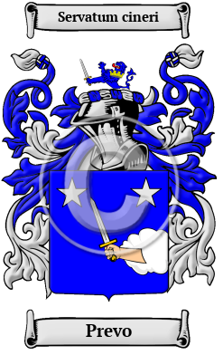 England Early Origins of the Prevo familyThe surname Prevo was first found in Rutland where they held a family seat as Lords of the Manor. After the Battle of Hastings in 1066, William, Duke of Normandy, having prevailed over King Harold, granted most of Britain to his many victorious Barons. It was not uncommon to find a Baron, or a Bishop, with 60 or more Lordships scattered throughout the country. These he gave to his sons, nephews and other junior lines of his family and they became known as under-tenants. They adopted the Norman system of surnames which identified the under-tenant with his holdings so as to distinguish him from the senior stem of the family. After many rebellious wars between his Barons, Duke William, commissioned a census of all England to determine in 1086, settling once and for all, who held which land. He called the census the Domesday Book, 1 indicating that those holders registered would hold the land until the end of time. Hence, conjecturally, the surname is descended from the tenant of the lands who was recorded in the Domesday Book census of 1086. This notable family, Prevost de la Croix, held a family seat in Poinou. They held the fiefs of Sonnotte, Prejailly, Villette, Bodes, le Pesse, and Bouteliere. Early History of the Prevo familyThis web page shows only a small excerpt of our Prevo research. Another 73 words (5 lines of text) covering the year 1410 is included under the topic Early Prevo History in all our PDF Extended History products and printed products wherever possible. Prevo Spelling VariationsSpelling variations of this family name include: Prevost, Provost, le Prevost, le Provost, Provest, Prevest and many more. Early Notables of the Prevo family- the Prevost family of Rutland