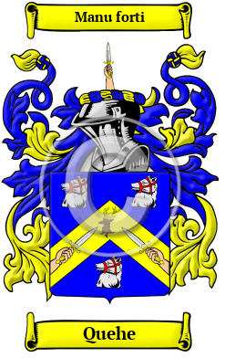 Ireland Scotland Etymology of QueheWhat does the name Quehe mean? The age-old Pictish-Scottish family name Quehe is derived from the personal name Aodh, a cognate of Hugh. The Gaelic form of the name is usually Mac Aoidh and in Inverness, the Gaelic form of the name Quehe is Mac Ai. "Nothing certain is known of the origin of the northern Mackays beyond the fact that they were early connected with Moray, and may have been a part of the ancient Clann Morgunn. The Inverness-shire Mackays are usually called in Gaelic Mac Ai, that is, MacDhai, or Davidson; they formed a branch of Clan Chattan." 1 Quehe Coat of Arms CreationWhen Queen Mary was at Inverness, Mackay of Farr disregarded her summons to appear before her. Because of this a commission was granted to the Earl of Sutherland to invade the lands of Strathnaver. He besieged Castle Borve, which was held by a small force of twenty reso-lute clansmen, but the castle was taken and demolished. (Canon were used for the first time in the North of Scotland in this siege). It is said that when Mackay was asked by the Earl of Sutherland to exhibit his charter for his lands he put his hand, clasping a dirk, upon the table and exclaimed "Lamh laidir," the Latin of which, "mane forti" (with a strong hand), has been the motto of the clan ever since. 2 Early Origins of the Quehe familyThe surname Quehe was first found in Sutherland (Gaelic: Cataibh), a former county in northern Scotland, now part of the Council Area of Highland, where early records show that Gilcrest M'Ay, forefather of the MacKay family of Ugadale, made a payment to the constable of Tarbert in 1326. It is claimed that the Clan is descended from the royal house of MacEth. Early History of the Quehe familyThis web page shows only a small excerpt of our Quehe research. Another 299 words (21 lines of text) covering the years 1329, 1408, 1411, 1429, 1506, 1575, 1640, 1689, 1692, 1726, 1873, 1890 and 1940 are included under the topic Early Quehe History in all our PDF Extended History products and printed products wherever possible. Quehe Spelling VariationsIn medieval Scotland, names were more often spelled according to sound than any regular set of rules. An enormous number of spelling variations were the result. Over the years, the name Quehe has been spelled MacKay, MacCay, MacQuey, MacQuoid, MacKaw, MacKy, MacKye, MacCoy, McCoy and many more. Early Notables of the Quehe familyHugh Mackay (c. 1640-1692), Scottish general, Major-General Commanding in Chief in Scotland in 1689, killed at the Battle of Steinkeerke; and the infamous John Macky (died 1726), a Scottish... Another 28 words (2 lines of text) are included under the topic Early Quehe Notables in all our PDF Extended History products and printed products wherever possible. Migration of the Quehe family to IrelandSome of the Quehe family moved to Ireland, but this topic is not covered in this excerpt. Another 133 words (10 lines of text) about their life in Ireland is included in all our PDF Extended History products and printed products wherever possible. Migration of the Quehe familyIn such difficult times, Ireland, Australia, and North America looked like better homes for many Scots. The trips were expensive and grueling, but also rewarding, as the colonies were havens for those unwelcome in the old country. That legacy did not die easily, though, and many were forced to fight for their freedom in the American War of Independence. The Scottish legacy has resurface in more recent times, though, through Clan societies, highland games, and other organizations. Immigration and passenger lists have shown many early immigrants bearing the old Scottish name of Quehe: Denis McCoy and his wife Catharine, who were colonists in Amelia county, Virginia in 1719; Agnes, Angus, Alexander, Anna, Catherine, Daniel, George, James, John, Margaret, Neil, Samuel and William McKay, who all arrived in Pennsylvania in 1772.