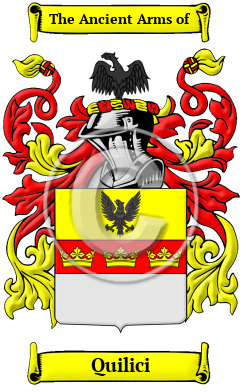 The surname Quilici was first found in Calabria, a province at the southern tip of Italy which, though not on the island of Sicily was part of the Kingdom of Two Sicilies. The name is frequently found in other parts of the south of Italy, though some members of the family did move further north. Those that remained in the south kept the southern suffix "-o," while those that moved north adopted the northern convention of ending their name in "-i." Many surnames were taken from the occupation of the person who first took the name. This name is one such name, coming from the Italian word "chierico," meaning "altar boy."