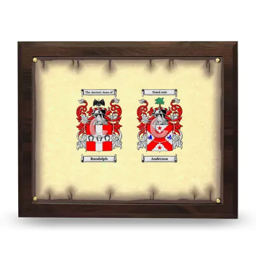Luxurious walnut finished plaque with two Coats of Arms and an optional message below the two crests.