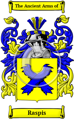 The surname Raspis was first found in Ravenna, a city of Emilia, capital of the province of Ravenna. It dates back to the 2nd century B.C. It came under the dominance of Rome. Augustus made it his fleet port. It fell to the Goths but Justinian sent an army in 535 A.D and restored it to Italy. By the 13th it was independent under the papal states, and generally, except for the French revolution, remained so. It is rich in art, museums, galleries, churches and history. In the year 1050, the Raspino family were found original at Carlomano. In those ancient times only persons of rank, the podesta, clergy, city officials, army officers, artists, landowners were entered into the records. To be recorded at this time was in itself a family honor.