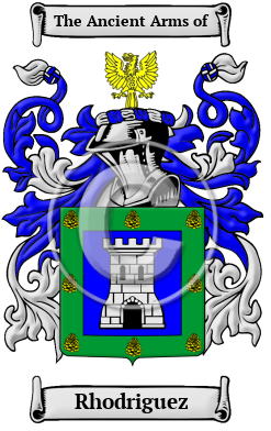 | Rhodriguez History, Family Crest & Coats of Arms Etymology of RhodriguezWhat does the name Rhodriguez mean? The prestigious surname Rhodriguez originated in Spain, a country which has figured prominently in world affairs for hundreds of years. The name is patronymic in origin, deriving from the name of the father of the initial bearer, and its roots can be traced back to the Visigoths, the Germanic tribe who ruled Spain between the mid-5th and early 8th centuries. Rhodriguez is derived from the Germanic personal name "Hrodric," which is composed of the elements "hrod," meaning "renown," and "ric," meaning "power." Thus, the name Rhodriguez combines this personal name with the patronymic suffix "-ez," and refers to "a famous ruler." Early Origins of the Rhodriguez familyThe surname Rhodriguez was first found in Castile, where the name originated in Visigothic times. Early History of the Rhodriguez familyThis web page shows only a small excerpt of our Rhodriguez research. Another 151 words (11 lines of text) covering the years 1194, 1199, 1228, 1300, 1380, 1410, 1440 and 1581 are included under the topic Early Rhodriguez History in all our PDF Extended History products and printed products wherever possible. Rhodriguez Spelling VariationsSpelling variations of this family name include: Rodríguez, Rodriguez, Rhodriquez, Rhodriguez, Rodriz, Rodríguiz, Rodriguiz, Rodrigo, Roderiz, Ruderiz, Roiz and many more. Early Notables of the Rhodriguez familywere Pedro Ruiz de Guzmán, majordomo of King Alfonso IX in 1194; Gonzalo Ruiz, who took over the same post in 1199; Rodrigo Rodríguez, Count of Castile in 1228; Gonzalo Ruiz de Cieza, a fourteenth century nobleman; Gonzalo Ruiz de Toledo, Count of Orgaz and Chancellor of Castile in the early 1300s; Juan Ruiz, Archpriest of Hita and author of the medieval Spanish masterpiece, "Libro de buen amor"; Gonzalo Rodríguez, poet and Archdeacon of Toro around 1380; Beatriz... Another 78 words (6 lines of text) are included under the topic Early Rhodriguez Notables in all our PDF Extended History products and printed products wherever possible. Migration of the Rhodriguez familySome of the first settlers of this family name or some of its variants were: Francisco Ruiz Galán, who journeyed to Argentina with Pedro de Mendoza in 1536. Also of note was Garci Rodríguez de Vergara, who accompanied Alvar Nú.