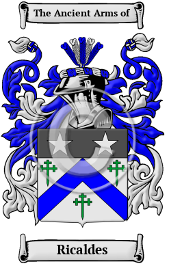 The surname Ricaldes was first found in Suffolk where they held a family seat as Lords of the Manor. After the Battle of Hastings in 1066, William, Duke of Normandy, having prevailed over King Harold, granted most of Britain to his many victorious Barons. It was not uncommon to find a Baron, or a Bishop, with 60 or more Lordships scattered throughout the country. These he gave to his sons, nephews and other junior lines of his family and they became known as under-tenants. They adopted the Norman system of surnames which identified the under-tenant with his holdings so as to distinguish him from the senior stem of the family. After many rebellious wars between his Barons, Duke William, commissioned a census of all England to determine in 1086, settling once and for all, who held which land. He called the census the Domesday Book, 1 indicating that those holders registered would hold the land until the end of time. Hence, conjecturally, the surname is descended from the tenant of the lands of Bury, held by a Norman noble who was recorded in the Domesday Book census of 1086.