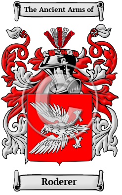 The surname Roderer was first found in the Rhineland, where the name became noted for its many branches within the region, each house acquiring a status and influence which was envied and enrolled by the princes of the region. The name can be traced back to the mediaeval German word Rod-her, meaning "famous soldier." The family moved north from early on, and chronicles first mention the Pomeranian knight Roderus of Rostock in 1282, Henrich Roder of Rostock in 1299, Nicolaus Roeder of Greifswald in 1385, and Conrad Roederer of Ortenau in 1300. In their later history the family became quite powerful and were elevated to the ranks of nobility.
