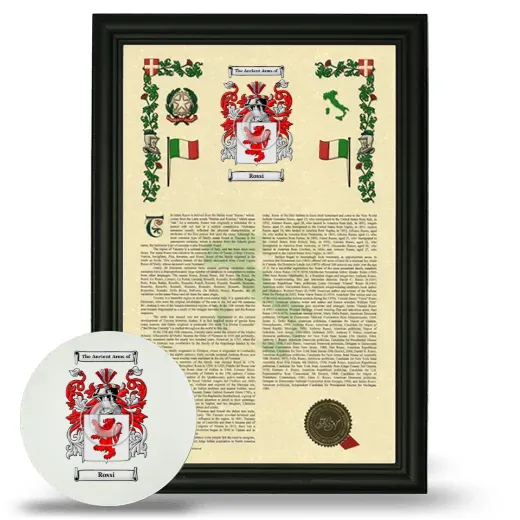 The Armorial will be framed with our custom solid 1" wood frame which beautifully compliments the earliest rendition of your Coat of Arms, Family Crest, and Surname History.
