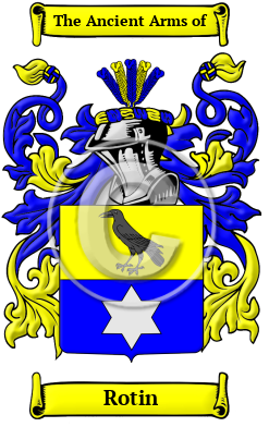 The surname Rotin was first found in Baden, where the name was anciently associated with the tribal conflicts of the area. They declared allegiances to many nobles and princes of early history, lending their influence in struggles for power and status within the region. They branched into many houses, and their contributions were sought by many leaders in their search for power.