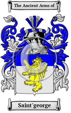 | Saint'george History, Family Crest & Coats of Arms Early Origins of the Saint'george familyThe surname Saint'george was first found in St. Goerge, near St. Lo, in the Cotentin, Normandy. Some of the first records of the family include: Helias de St. George who occurs in Sussex in the time of Henry I. and Baldwin de St. George, at about the same date, who witnesses a charter of William Peverel of Dover. 1 "The descendants of Baldwin St. George, the Norman, flourished in England for several centuries, and frequently represented the County of Cambridge in parliament. They were seated at Hartley St George, in that shire, full 500 years." 2 "This place was for a long period in the possession of the St. Georges, who had their chief seat and a park here, and held the estate so early as the reign of Henry III. " 3 Most of the family claim descent from the aforementioned Baldwin de St. George or Baldwin St. George, knight of the shire for Cambridge in 1381 who married the heiress or co-heiress of John d'Engayne, who brought him several manors in the county. Sir Richard Saint George, Clarencieux King of Arms was the first herald in this family of heralds,* and stated to be eighteenth in descent from the first Baldwin de St. George. He "had two younger sons who both settled in Ireland. One of them, Sir George, was grandfather to another Sir George, created Lord St. George in the peerage of Ireland in 1715. His title expired with him, but in 1763 was revived in favour of St. George Usher, who was the son of his only child, Mrs. Usher. The other brother Richard had a numerous posterity. From him descend the St. Georges of Parsonstown, the St. Georges of Wood Park, co. Armagh, the St. Georges of Woodside, Cheshire, the St.Georges of Camma Lodge in Roscommon, and the St. Georges of Woodsgift, who received a baronetcy in 1766." 1 Richard St. George who went to Ireland in the beginning of the 17th century in the Royal Army was appointed governor of Castle Athlone. 2 Early History of the Saint'george familyThis web page shows only a small excerpt of our Saint'george research. Another 158 words (11 lines of text) covering the years 1172, 1362, 1394, 1401, 1404, 1406, 1409, 1410, 1414, 1426, 1510, 1534, 1550, 1581, 1600, 1615, 1616, 1625, 1627, 1635, 1640, 1644, 1645, 1657, 1658, 1659, 1669, 1677, 1686, 1695, 1703, 1713, 1715, 1726 and 1735 are included under the topic Early Saint'george History in all our PDF Extended History products and printed products wherever possible. Saint'george Spelling VariationsSpelling variations of this family name include: St.George, St George, Saint Geroge and others. Early Notables of the Saint'george familySir Baldwin St. George (1362-1426), of Hatley St. George, Cambridgeshire, an English politician, Member of the Parliament of England for Cambridgeshire in 1394, 1401, October 1404, 1406, April 1414 and served as High Sheriff of Cambridgeshire and Huntingdonshire for 1409-1410.