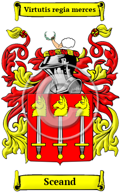 Scotland Ireland Etymology of SceandWhat does the name Sceand mean? The Sceand surname is thought to be derived from the Aberdeenshire parish of the same name. Legend has it that the first bearer of the name was second son of Struan Robertson, who saved king Malcolm II (circa 1014) by slaying a wolf with his "sgian," or "skene," (Scottish dagger) in Stocket Forest. which meant "a dagger." It is said that he was rewarded with the lands of Skene and henceforth used the name Skene. 1 "The Skenes obtained this name for killing a very big and fierce wolf, at a hunting in company with the king, in Stocket forest in Athole; having killed the wolf with a dagger or skene." 2 "Some derive their names as well as their arms from some considerable action, and thus a son of Struan Robertson, for killing a wolf in Stocket forest in Athole, in the king's presence, with a dirk, received the name of Skene, which signifies a dirk, and three dirks points in pale, for his arms." 3 Sceand Coat of Arms CreationThis is an Aberdeenshire clan. The crest is a right arm issuing from a cloud, holding in the hand a triumphant crown or garland. The motto is " Virtutis regia merces" (A palace the reward of bravery). There are at least two legends to account for the name Skene. One is that Malcolm Canmore, on his return south from the defeat of the Danes at Mortlake, in Moray, in 1010, was pursued by a wolf through the wood of Culblean to the forest of Stocket, near Aberdeen, where one of his retainers slew it, and hence in the Skene arms three dirks or sgians, on the points of which are wolves' heads. Another version is that while hunting in, Aberdeenshire the King was pursued by a wild boar, and that one of the family of Macdonald, or, as another authority has it, a Robertson, saw the King's danger and came to the rescue. He wrapped his plaid round his left atm, thrust it into the animal's mouth, and then stabbed it to the heart with his dirk. For this he got a grant of land, and called it and himself Skene, which is the pronunciation of the Gaelic word sgian, a dirk, and for a supporter to his arms a Highlander in his proper garb holding in his right hand a dirk. 4 Early Origins of the Sceand familyThe surname Sceand was first found in Aberdeenshire (Gaelic: Siorrachd Obar Dheathain), a historic county, and present day Council Area of Aberdeen, located in the Grampian region of northeastern Scotland, where they held a family seat sometime before the year 1250. The family had always maintained the rank of free Barons and held the Castle Skene, and the Earldom of Mar in Aberdeen. The family is "of territorial origin from the lands of Skene, Aberdeenshire, erected into a barony in 1317 in favor of Robert de Skene. The first record of the name is in 1296 when Johan de Skene of the county of Edneburk and Johan de Skene of the county of Aberdene rendered homage [to King Edward I of England]. Probably, like many other old families, the Skenes were hereditary possessors of the church of Skene, a vicarage dependent upon the church of Kinkell, and toox their name from it. This supposition is rendered probable by the designation of Patrick as a cleric, and by the fact that in 1358 a Giliane de Skene is mentioned who is probably a descendant of the John de Skene who bore the head of John the Baptist on his seal." 5 Early History of the Sceand familyThis web page shows only a small excerpt of our Sceand research. Another 147 words (10 lines of text) covering the years 1296, 1317, 1411, 1543, 1597, 1617 and 1825 are included under the topic Early Sceand History in all our PDF Extended History products and printed products wherever possible. Sceand Spelling VariationsSpelling variations of this family name include: Skene, Skeyne, Skeen, Skeene, Skin and many more. Early Notables of the Sceand familySir John Skene (1543-1617), who acquired Curriehill (taking the title Lord Curriehill); he was a much published lawyer in Scotland, who compiled the Scottish legal dictionary De Verborum Signicationela, in... Another 30 words (2 lines of text) are included under the topic Early Sceand Notables in all our PDF Extended History products and printed products wherever possible. Migration of the Sceand family to IrelandSome of the Sceand family moved to Ireland, but this topic is not covered in this excerpt. Another 55 words (4 lines of text) about their life in Ireland is included in all our PDF Extended History products and printed products wherever possible. Migration of the Sceand familySome of the first settlers of this family name or some of its variants were: John Skene who settled in West New Jersey in 1664; Robert Skene, who was on record in Maryland in 1700; Thomas Skene, who arrived in South Carolina in 1760.