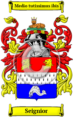 England Etymology of SeigniorWhat does the name Seignior mean? Seignior is a name whose history dates possibly as far back as 1066 when the Normans first arrived in Britain following their Conquest of the island. It was a name for a person with lordly bearing, or the older of two people with the same name. The first is by analogy with the French seigneur, meaning lord. Early Origins of the Seignior familyThe surname Seignior was first found in Norfolk, where the family was granted lands by William the Conqueror for having assisted at the Battle of Hastings in 1066. The earliest known bearer of the name was Walter Seignure, who was recorded in the Pipe Rolls of Norfolk in 1164. Early History of the Seignior familyThis web page shows only a small excerpt of our Seignior research. Another 176 words (13 lines of text) covering the years 1150, 1164, 1212, 1271, 1382, 1475, 1565, 1845 and 1887 are included under the topic Early Seignior History in all our PDF Extended History products and printed products wherever possible. Seignior Spelling VariationsSpelling variations in names were a common occurrence in the eras before English spelling was standardized a few hundred years ago. In the Middle Ages, even the literate regularly changed the spellings of their names as the English language incorporated elements of French, Latin, and other European languages. Many variations of the name Seignior have been found, including Senior, Sinyeard, Singard, Sinyard, Sinor, Sayner, Saynor, Sayner and many more. Early Notables of the Seignior familyAnother 33 words (2 lines of text) are included under the topic Early Seignior Notables in all our PDF Extended History products and printed products wherever possible. Migration of the Seignior familyFor many English families, the social climate in England was oppressive and lacked opportunity for change. For such families, the shores of Ireland, Australia, and the New World beckoned. They left their homeland at great expense in ships that were overcrowded and full of disease. Many arrived after the long voyage sick, starving, and without a penny. But even those were greeted with greater opportunity than they could have experienced back home. Numerous English settlers who arrived in the United States and Canada at this time went on to make important contributions to the developing cultures of those countries. Many of those families went on to make significant contributions to the rapidly developing colonies in which they settled. Early North American records indicate many people bearing the name Seignior were among those contributors: Eliz Senior, who settled in Virginia in 1666; Jacob Senior, who arrived in Nevis in 1679; Joseph Senior, who arrived in Barbados in 1680 with his four servants, Jane Senior, who came to Virginia in 1728.