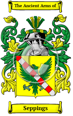 The surname Seppings was first found in Suffolk where they held a family seat as Lords of the Manor. The Saxon influence of English history diminished after the Battle of Hastings in 1066. The language of the courts was French for the next three centuries and the Norman ambience prevailed. But Saxon surnames survived and the family name was first referenced in the year 1540 when Nycholas Sevenpennys held lands.