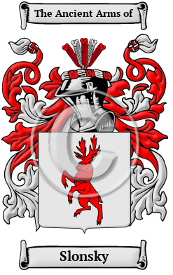 The surname Slonsky was first found in Polesie, the largest province of Poland. It is inhabited by Ruthenians, called Polesians, of Ukrainian descent. The main towns are those of Brest Litovsk, Pinsk, Kobryn, Kamenets, Litovsk, and Luninets. It was in this province that the renowned Radziwills and Sapiehas held their vast estates. The family were originally seated in Cracow and arrived in the province in 1573 and were originally of the royal Clan Brochwicz. The surname became noted for its many branches in the region, each house acquiring a status and influence which was envied by the princes of the region. In their later history the name became a power unto themselves and were elevated to the ranks of nobility as they grew into this most influential family.