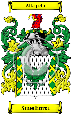 England Early Origins of the Smethurst familyThe surname Smethurst was first found in Lancashire at either Smethurst or Smithurst, both lost locations that are presumed to have been in the near Rochdale or Bury. 1 One source claims the name is a "habitational name from a minor place near Manchester, so called from the Old English "smeeth" + "hryst." 2 Other sources agree with slightly different spellings: having derived from the words "smeeth" and "hurst" which together meant "the wood of the plain" 3 or "the smith's wood." 4 In early times, the family were Lords of the manor of Chorley in Lancashire as this is where the coat of arms is recorded, but we must look to Cheshire to find the most early records of the family. There we found the Wills at Chester listing Richard Meadowcroft, of Smethurst, 1581; John Smethurst, of Blakeley, 1582; and Richard Smethurst, of Bury, 1618. While Richard Meadowcroft has no known relationship to the family, this source proves that Smethurst still existed in 1581. According to the Register of the University of Oxford, Richard Smethurst, from Cheshire attended there 1591-1592. 1 Early History of the Smethurst familyThis web page shows only a small excerpt of our Smethurst research. Another 49 words (4 lines of text) covering the year 1881 is included under the topic Early Smethurst History in all our PDF Extended History products and printed products wherever possible. Smethurst Spelling VariationsSpelling variations of this family name include: Smethurst, Smethirst and others. Early Notables of the Smethurst family- James Smethurst, of Gartmore, co...
