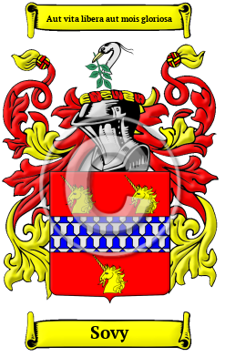 The surname Sovy was first found in Devon where they held a family seat from very early times and were granted lands by Duke William of Normandy, their liege Lord, for their distinguished assistance at the Battle of Hastings in 1066 A.D.