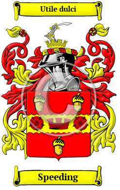 The surname Speeding was first found in Cumberland, where they held a family seat from very ancient times, some say, long before the Norman Conquest in 1066 A.D.