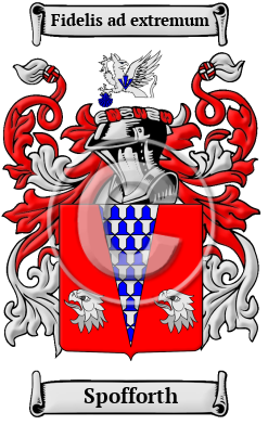 England Etymology of SpofforthWhat does the name Spofforth mean? Spofforth is a name of ancient Anglo-Saxon origin and comes from the family once having lived in the parish of Spofforth in Knaresborough in Yorkshire. Early Origins of the Spofforth familyThe surname Spofforth was first found in the West Riding of Yorkshire at Spoffarth, a parish, in the Upper division of the wapentake of Claro. "This place was the residence of the Percy family previously to their settlement at Alnwick, and possessed a formidable castle, their baronial seat, which was demolished by the Yorkists after the battle of Towton, in which the Earl of Northumberland, and his brother Sir Charles Percy, were slain. The remains consist chiefly of the grand hall, which, though a ruin, retains much of its ancient magnificence. The church is a spacious and handsome structure, partly in the Norman and early English styles, and contains a monument with a recumbent figure of a Knight Templar. " 1 Listed as Spoford in the Domesday Book of 1086, by 1218 the parish was known as Spotford. Literally the place name means "ford by a small plot of ground," from the Old English words "spot" + "ford." 2 Early History of the Spofforth familyThis web page shows only a small excerpt of our Spofforth research. Another 49 words (4 lines of text) covering the years 1421 and 1448 are included under the topic Early Spofforth History in all our PDF Extended History products and printed products wherever possible. Spofforth Spelling VariationsSound was what guided spelling in the essentially pre-literate Middle Ages, so one person's name was often recorded under several variations during a single lifetime. Also, before the advent of the printing press and the first dictionaries, the English language was not standardized. Therefore, spelling variations were common, even among the names of the most literate people. Known variations of the Spofforth family name include Spaford, Spafford, Spafforde, Spafforth and others. Early Notables of the Spofforth familyMore information is included under the topic Early Spofforth Notables in all our PDF Extended History products and printed products wherever possible.
