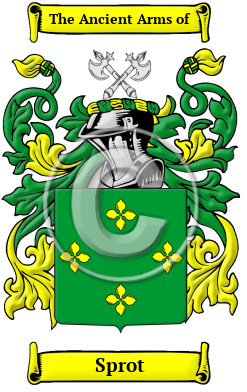 | Sprot History, Family Crest & Coats of Arms Early Origins of the Sprot familyThe surname Sprot was first found in Dorset, where the name appeared in the Domesday Book of 1086 as Sprott, which was later changed to Spratt. The family branched into Devon and they also branched to Wareham in Dorset. One source notes that the name could have been derived from "sprot (twig or small branch); one thought to possess some characteristic of a sprat (fish); dweller at the sign of the sprat. " 1 The Hundredorum Rolls of 1273 had various entries for the name in various counties: Henry Sprot, Cambridgeshire; Richard Sprot, Oxfordshire; and Simon Sprot in Bedfordshire. John Sprot was listed in Somerset, 1 Edward III (during the first year of King Edward III's reign. 2 Agnes Sproate was listed in the Yorkshire Poll Tax Rolls of 1379 and later John Sprott de Surlingham, Norfolk was listed in the History of Norfolk. 3 Much further to the north in Scotland, the name there was "perhaps from Sprot, an Old English personal name, but more likely to be of Scandinavian origin. The tradition of those bearing this name in Scotland is that their ancestors were Saxons who came into Scotland after the Norman Conquest of England. The first recorded of the name in Scotland appears to be Hugh Sprot of Ur who witnessed a charter by Eustace Baliol granting the church and lands of Hur (Urr) in 1262 to the monks of Holyrood. " 4 "Jack Sprat" (or "Jack Spratt") is an English language nursery rhyme that was first published in 1639 in John Clarke's collection of sayings. The rhyme was then later reprinted in Mother Goose's Melody around 1765. Early History of the Sprot familyThis web page shows only a small excerpt of our Sprot research. Another 160 words (11 lines of text) covering the years 1290, 1307, 1376, 1398, 1443, 1457, 1479, 1505, 1582, 1594, 1600, 1616, 1623, 1628, 1635, 1666, 1684, 1713, 1890 and 1987 are included under the topic Early Sprot History in all our PDF Extended History products and printed products wherever possible. Sprot Spelling VariationsSpelling variations of this family name include: Spratt, Spratte, Sprat, Sprett, Spret, Sprott and others. Early Notables of the Sprot family- Blessed Thomas Sprott (died 1600), also spelled Thomas Spratt, an English martyr from Skelsmergh, near Kendal in Westmorland; he was among the eighty-five martyrs of England and Wales beatified by Pop...