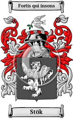 The surname Stök was first found in Pembrokeshire where they held a family seat from early times. One of the first records of the names was Saint Simon Stock (c. 1165-1265), an English saint who was probably born in Aylesford England. In a vision, The Blessed Virgin Mary appeared to him and gave him the Carmelite habit, the Brown Scapular and promised that those who die wearing it will be saved.