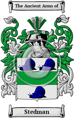 England Scotland Etymology of StedmanWhat does the name Stedman mean? The name Stedman is generally thought to have derived from a place name, such as Stead, in West Yorkshire. The place name in turn comes from the Old English word "stede," which means "estate" or "farm." Early Origins of the Stedman familyThe surname Stedman was first found in Gloucestershire, where the name was derived from "provincial English stead, a farmhouse and offices, + man. Symon le Stedeman was received to the English king's peace in 1321. Steidman is found in Angus, 1505. " 1 In the pre 12th century records the family is shown as branching to Dolgoer in Brecknockshire. Early History of the Stedman familyThis web page shows only a small excerpt of our Stedman research. Another 105 words (8 lines of text) covering the years 1572, 1574, 1621, 1633 and 1643 are included under the topic Early Stedman History in all our PDF Extended History products and printed products wherever possible. Stedman Spelling VariationsSpelling variations of this family name include: Stedman, Steadman and others. Early Notables of the Stedman familyMore information is included under the topic Early Stedman Notables in all our PDF Extended History products and printed products wherever possible. Stedman Rankingthe United States, the name Stedman is the 9,280th most popular surname with an estimated 2,487 people with that name. 2