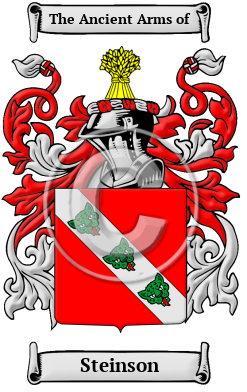 | Steinson History, Family Crest & Coats of Arms Etymology of SteinsonWhat does the name Steinson mean? This scripture name, like many others, was not introduced here until the Norman Conquest, after which we find it in the form of Fitz-Stephen. It occupies a large place among our surnames in the usual genitive forms of Stephens. Stevens, Steevens, Stephenson, Stevenson, &c. A nicked or abbreviated form furnishes us with our Steen, Steenson, Stimson, Stimpson, Stinson, Stibbs: perhaps also Stubbs, Steff, Stiff, and Stennett. Tiffany and Tiffin, from Stephanus, belong to the same category. 1 "This name was introduced into Britain by the Normans, with whom it was a favorite. Although found occasionally in England before 1066 its use then was due really to Christian tradition, Stephen (Stephanos) having been the first Christian martyr after Christ." 2 Early Origins of the Steinson familyThe surname Steinson was first found in Essex where Adam Steveneson was listed in the Subsidy Rolls of 1327. Later, John Stephenson was listed at Whitby, Yorkshire in 1395. 3 The Yorkshire Poll Tax Rolls of 1379 included an entry for Thomas Stevenson. 4 In Somerset, we found the truncated entries for Philip Stevene; and William Stevene, Somerset, 1 Edward III (during the first year of the reign of King Edward III.) 5 "The present family of Stimpson may possess an ancestor in John Stimpson, who lived at Burston, in Diss, in 1742." 6 John Stimpson from Norwich, Norfolk was listed there in 1742. 7 The first record of the Stinson variant was found in Yorkshire where Corpus Christi Guild (Surtees Society) listed Joseph Stinson, but no date was given. Welford's History of Newcastle and Gateshead records "in a muster-roll of able-bodied men at Newcastle-on-Tyne in 1539 occur the names of: Edward Stynson; Stewyn Sotheron; Allen Stewenson; and John Stewynsone. 8 Early History of the Steinson familyThis web page shows only a small excerpt of our Steinson research. Another 180 words (13 lines of text) covering the years 1150, 1296, 1455, 1552, 1581, 1583, 1584, 1585, 1624, 1654, 1685, 1742, 1764, 1833 and 1890 are included under the topic Early Steinson History in all our PDF Extended History products and printed products wherever possible. Steinson Spelling VariationsSpelling variations of this family name include: Stevenson, Stephenson, Stephinson, Stevenston, Steenson, Stenson, Steinson and many more. Early Notables of the Steinson familyThomas Stephenson (1552-1624), English Jesuit, born in 1552 of Catholic parents at Windlestone in the parish of St. Andrews, Auckland, Durham. He studied his humanities in England, and went through the higher course at the English College of Douay, then temporarily settled at Rheims, where he arrived on 22 June 1581. He was ordained priest there on 21 Dec. 1581, and was sent to the English mission on 13 April 1583. He was arrested on 13 Feb. 1583-1584, committed to... Another 79 words (6 lines of text) are included under the topic Early Steinson Notables in all our PDF Extended History products and printed products wherever possible. Migration of the Steinson family to IrelandSome of the Steinson family moved to Ireland, but this topic is not covered in this excerpt. Another 186 words (13 lines of text) about their life in Ireland is included in all our PDF Extended History products and printed products wherever possible. Migration of the Steinson familySome of the first settlers of this family name or some of its variants were: Joseph Stephenson who settled in Argentia, in Newfoundland, in 1730; William and Mathew Stevenson settled in Harbour Grace, Newfoundland, in 1760; Andrew Stevenson settled at Charlestown Massachusetts in 1630.