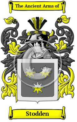 England Etymology of StoddenWhat does the name Stodden mean? The Stodden surname belongs to the class of local names, derived from a place name where the first bearer lived or held land. Stodden is derived from the Old English elements "stod," meaning "stud" and "dun," meaning "hill." There were at least six places in Devon alone from which the surname could have come. Early Origins of the Stodden familyThe surname Stodden was first found in Devon, 1 where Hugh de Stoddon was listed in the Pipe Rolls of 1200. It is generally thought the name came from an unidentified place in Devon, but the name may have also originated in Sussex where Symon de Stoddenn was recorded in 1296 and later, Jacobus de Stoddenne was listed in the Subsidy Rolls of 1332. In this latter case, the name may elude to Studding’s Farm in Herstmonceux, Sussex. 2 Early History of the Stodden familyThis web page shows only a small excerpt of our Stodden research. Another 86 words (6 lines of text) covering the years 1200, 1296, 1327, 1332, 1377, 1453 and 1642 are included under the topic Early Stodden History in all our PDF Extended History products and printed products wherever possible. Stodden Spelling VariationsSpelling variations of this family name include: Stoddon, Staddon, Staddin and others. Early Notables of the Stodden familyMore information is included under the topic Early Stodden Notables in all our PDF Extended History products and printed products wherever possible.