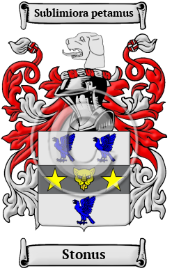 England Early Origins and Etymology of StonusThe surname Stonus was first found in Gloucestershire at Stonehouse, a parish, in the union of Stroud, Lower division of the hundred of Whitstone. 1 2 This is presumed to be the oldest at it is listed in the Domesday Book of 1086 as Stanhus. 3 However, East Stonehouse (commonly called Stonehouse), a town and parish, forming a union of itself, in the borough of Devonport, and suburbs of Plymouth, Roborough and S. divisions of Devon may arguably be of the same vintage. "This place, originally called Hipperston, was in the reign of Henry III. the property of Joel de Stonehouse, from whom it derives its present name." 1 The hamlet of West Stonehouse stood on the opposite shore of the harbour, near Cremill, and Mount Edgcumbe, until burnt by the French, some centuries ago. "The manor came to a family named thence of Stonehouse, and from them it passed by marriage to the Durnfords." 4 No dates were given for this record, but we do know that the manor was originally held by Robert the Bastard at the date of the compilation of 'Domesday' and had passed on to the Stonehouse family from him. 4 As far as early rolls are concerned, John de Stonhus, Gloucestershire was listed in the Hundredorum Rolls of 1273 and John del Stonhuse, was listed in the Close Rolls, 47 Henry III (during the 47th year of King Henry III's reign.) 5 Another source notes Alexander de Stonhuse was listed in Cheshire in 1257; Ranulf del Stonhouse in the Subsidy Rolls of Staffordshire in 1332; and Henry atte Stonehouse in Surrey in 1359. 6 As one would imagine, the name literally means "Dweller at the Stone House [Old English stán + hús]" 7 Early History of the Stonus familyThis web page shows only a small excerpt of our Stonus research. Another 88 words (6 lines of text) covering the years 1350, 1603, 1639, 1640, 1641, 1644, 1675, 1689, 1690 and 1700 are included under the topic Early Stonus History in all our PDF Extended History products and printed products wherever possible. Stonus Spelling VariationsSpelling variations of this family name include: Stonehouse, Stonhouse and others. Early Notables of the Stonus familySir William Stonhouse, 1st Baronet of Radley; Sir John Stonhouse, 2nd Baronet (1639- 1700), an English politician, Member of Parliament for Abingdon (1675-1689) and in 1690; Sir George Stonhouse, 3rd Baronet (1603-1675)... Another 31 words (2 lines of text) are included under the topic Early Stonus Notables in all our PDF Extended History products and printed products wherever possible. Migration of the Stonus familySome of the first settlers of this family name or some of its variants were: William Stonehouse who landed in America in 1746; David, Jane, and Robert and seven children settled in Marblehead, Massachusetts in 1821; James Stonehouse settled in Philadelphia, Pennsylvania in 1833.