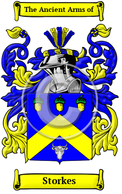The surname Storkes was first found in Kent where they held a family seat. The Saxon influence of English history diminished after the Battle of Hastings in 1066. The language of the courts was French for the next three centuries and the Norman ambience prevailed. But Saxon surnames survived and the family name was first referenced in the year 1198 when Osbert Storc held estates in that shire.