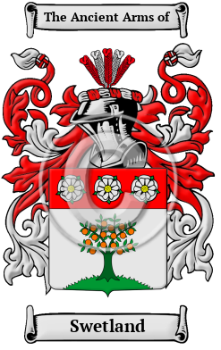 England Etymology of SwetlandWhat does the name Swetland mean? The origins of the Swetland name come from when the Anglo-Saxon tribes ruled over Britain. The name Swetland was originally derived from a family having lived in the area that was referred to as Sweetland found in the county of Devon. The surname Swetland is a habitation name that was originally derived from pre-existing names for towns, villages, parishes, or farmsteads. The surname originated as a means of identifying individuals from a particular area. In the Middle Ages people often assumed the name of the place that they originally lived as their surname during the course of travel. As a general rule, the greater the distance between an individual and their homeland, the larger the territory they were named after. For example, a person who only moved to another parish would be known by the name of their original village, while people who migrated to a different country were often known by the name of a region or country from which they came. Early Origins of the Swetland familyThe surname Swetland was first found in Devon where from ancient times they held Sweetland's Farm, a name which would later become a surname and a place name in Devon. 1 Another source presumes that the name could have been from Swithland, a parish, in the union of Barrow-upon-Soar, hundred of West Goscote,in Leicestershire. 2 Early History of the Swetland familyThis web page shows only a small excerpt of our Swetland research. Another 51 words (4 lines of text) are included under the topic Early Swetland History in all our PDF Extended History products and printed products wherever possible. Swetland Spelling VariationsBefore English spelling was standardized a few hundred years ago, spelling variations of names were a common occurrence. Elements of Latin, French and other languages became incorporated into English through the Middle Ages, and name spellings changed even among the literate. The variations of the surname Swetland include Sweetland, Swithland and others. Early Notables of the Swetland familyMore information is included under the topic Early Swetland Notables in all our PDF Extended History products and printed products wherever possible.