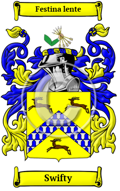 | Swifty History, Family Crest & Coats of Arms Etymology of SwiftyWhat does the name Swifty mean? The name Swifty comes from the ancient Anglo-Saxon culture of Britain. It was a name for a person who because of his physical abilities was referred to as swifte, which was an Old English word used to denote one who was quick, typically "speed of foot." 1 This was a name often given to a messenger or courier. 2 A broad and miscellaneous class of surnames, nickname surnames referred to a characteristic of the first person who used the name. They can describe the bearer's favored style of clothing, appearance, habits, or character. One source notes that the name may be "local, from Swift, a river of England." 3 4 Early Origins of the Swifty familyThe surname Swifty was first found in Norfolk where the mononym Suift was recorded in the Pipe Rolls of 1166. Years later, Nicholaus filius Swift was listed in the Curia Regis Rolls of 1222 and William Swift was found in the Pipe Rolls for Hampshire in 1167 and in the Assize Rolls for Yorkshire in 1219. 5 The Hundredorum Rolls of 1273 proved the widespread use of the name: Matilda Swyft, Cambridgeshire; Roger Swyft, Buckinghamshire; and Arnulph Swyft, Norfolk. The Yorkshire Poll Tax Rolls of 1379 included an entry for Henricus Swyft. 6 Pointing to the occupational nature of the name, the source Issues of the Exchequer, edited by Frederick Devon includes an entry for Ralph Swyft, courier to Edward III. "The name of Swift is also established in Derbyshire, the West Riding, and Nottinghamshire. In the 13th century there were Swifts and Swyfts in Derbyshire, Bucks, Cambridgeshire, Norfolk, and Suffolk." 7 To the north in Scotland, the "family of this name were burgesses of Edinburgh, and the chartulary of St. Giles contains frequent notices of them in the time of James II. John Swyft was burgess of Edinburgh in 1427." 8 Early History of the Swifty familyThis web page shows only a small excerpt of our Swifty research. Another 109 words (8 lines of text) covering the years 1478, 1534, 1599, 1627, 1634, 1640, 1667, 1707, 1713, 1726, 1734, 1736, 1739, 1745, 1746, 1754, 1783 and 1815 are included under the topic Early Swifty History in all our PDF Extended History products and printed products wherever possible. Swifty Spelling VariationsOnly recently has spelling become standardized in the English language. As the English language evolved in the Middle Ages, the spelling of names changed also. The name Swifty has undergone many spelling variations, including Swift, Swifte, Swyft, Swyfte and others. Early Notables of the Swifty familyRobert Swift (1534?-1599), Chancellor of Durham, born at Rotherham about 1534, belonged to a Yorkshire family settled there; and Jonathan Swift (1640-1667), English father of Jonathon Swift, the satirist.